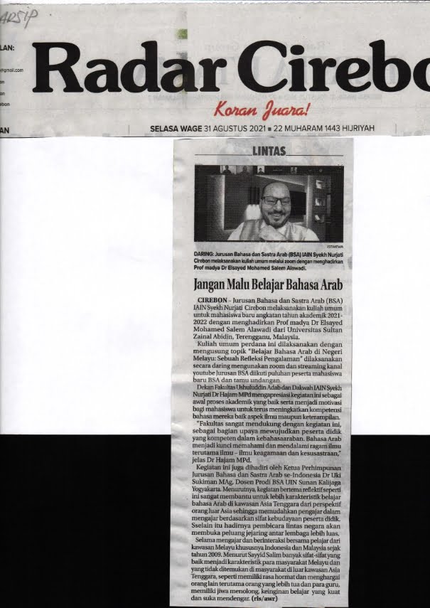 13 October 2021 • 1 Views • Jangan Malu Belajar Bahasa Arab (Radar Cirebon/31 Agustus 2021) Jangan Malu Belajar Bahasa Arab Kliping Digital