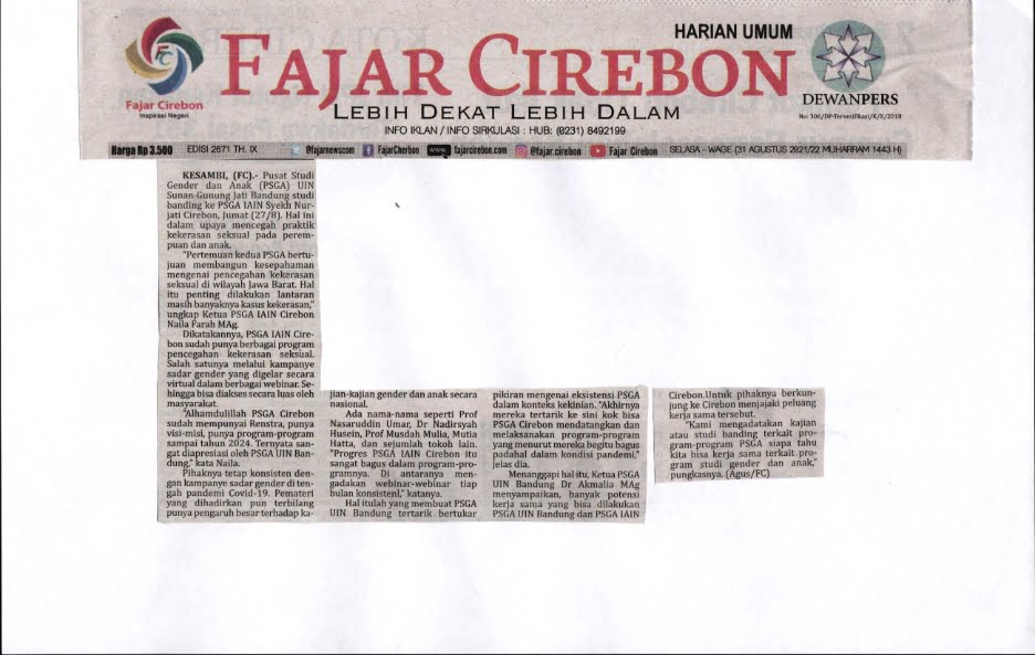 13 October 2021 • 1 Views • PSGA IAIN SNJ Menerima Kunjungan dari UIN Bandung (Fajar Cirebon/31 Agustus 2021) PSGA IAIN SNJ Menerima Kunjungan dari UIN Bandung Kliping Digital