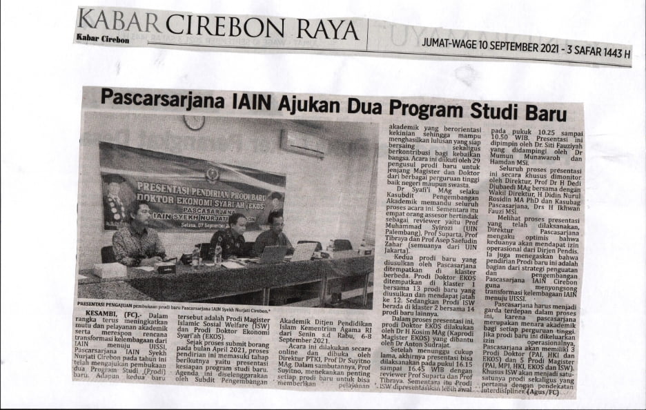 13 October 2021 • 3 Views • Pascasarjana IAIN Ajukan Dua Program Studi Baru (Kabar Cirebon/10 September 2021 Pascasarjana IAIN Ajukan Dua Program Studi Baru Kliping Digital