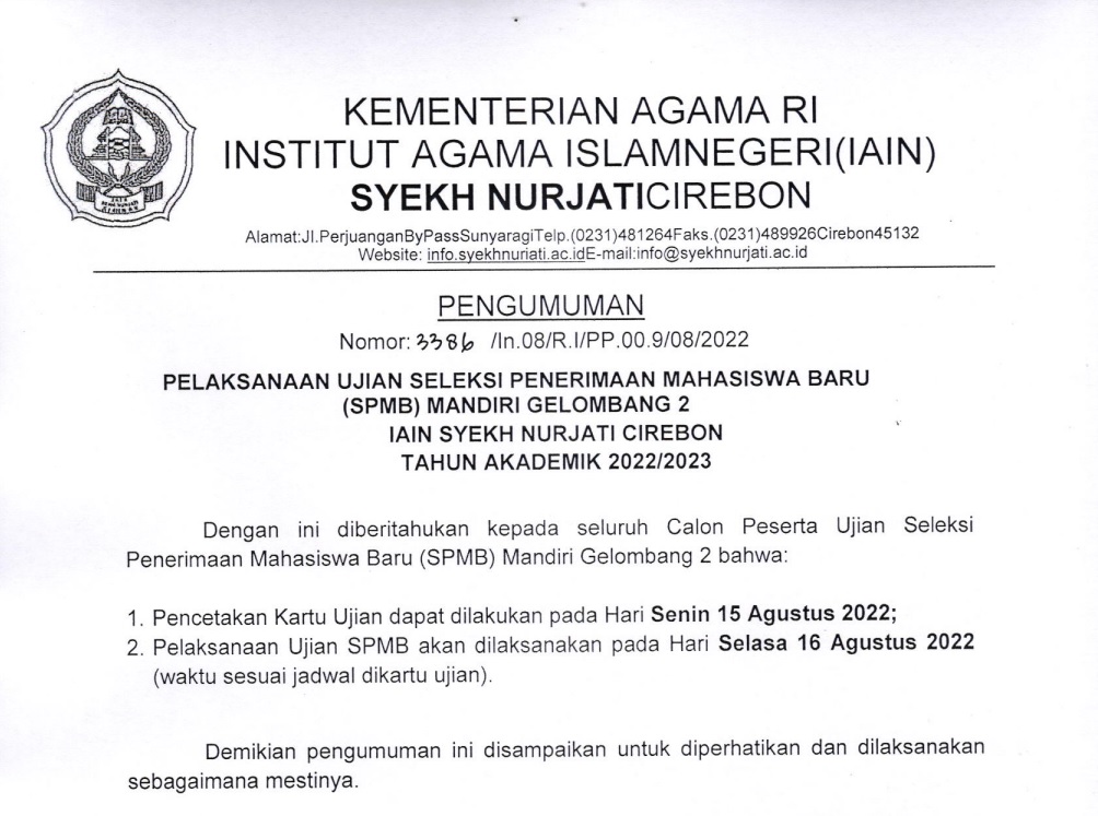 15 August 2022 • 1 Views • PENGUMUMAN PELAKSANAAN UJIAN SPMB MANDIRI GEL 2 TAHUN 2022 UNDUH PENGUMUMAN PENGUMUMAN PELAKSANAAN UJIAN SPMB MANDIRI GEL 2 TAHUN 2022 Pengumuman