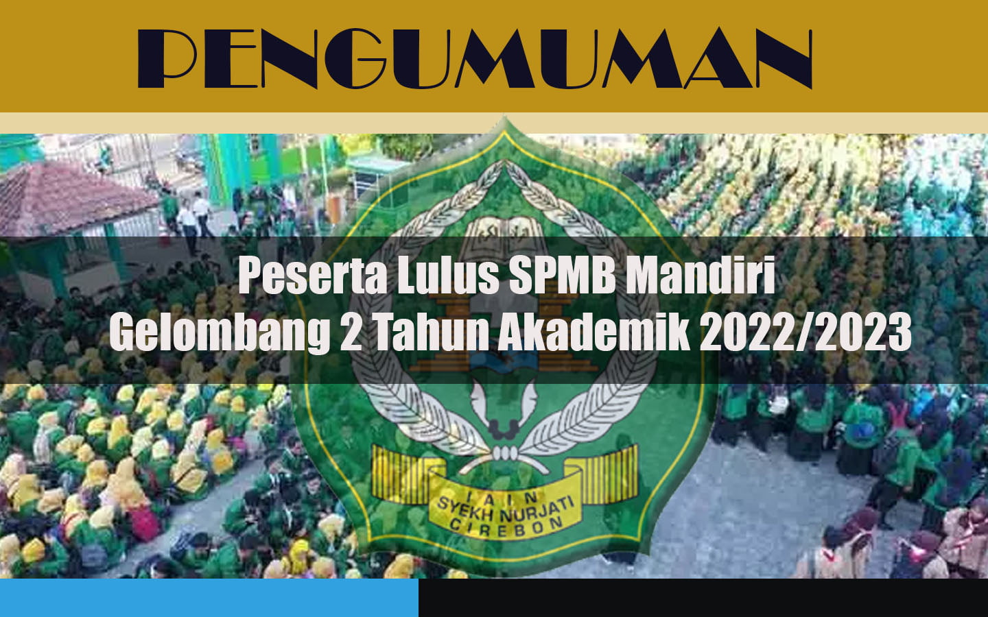 22 August 2022 • Pengumuman Pembayaran Uang Kuliah Tunggal (UKT) SPMB Jalur Mandiri Gelombang 2 IAIN Syekh Nurjati Cirebon Tahun Akademik 2022/2023 Unduh Pengumuman : PENGUMUMAN PEMBAYARAN UKT SPMB MANDIRI GEL 2 TAHUN 2022 Informasi Pengumuman