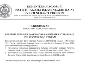 PENGUMUMAN PENERIMA BEASISWA BANK INDONESIA SEMESTER II TAHUN 2022 IAIN SYEKH NURJATI CIREBON