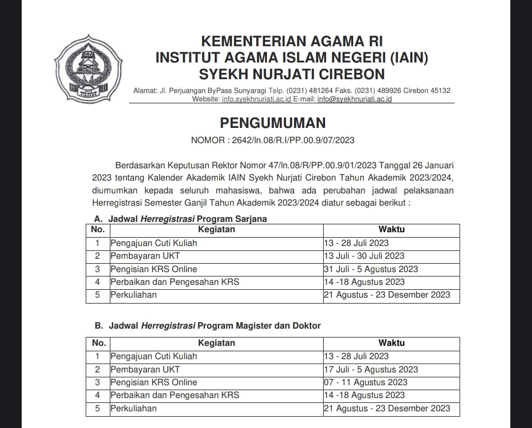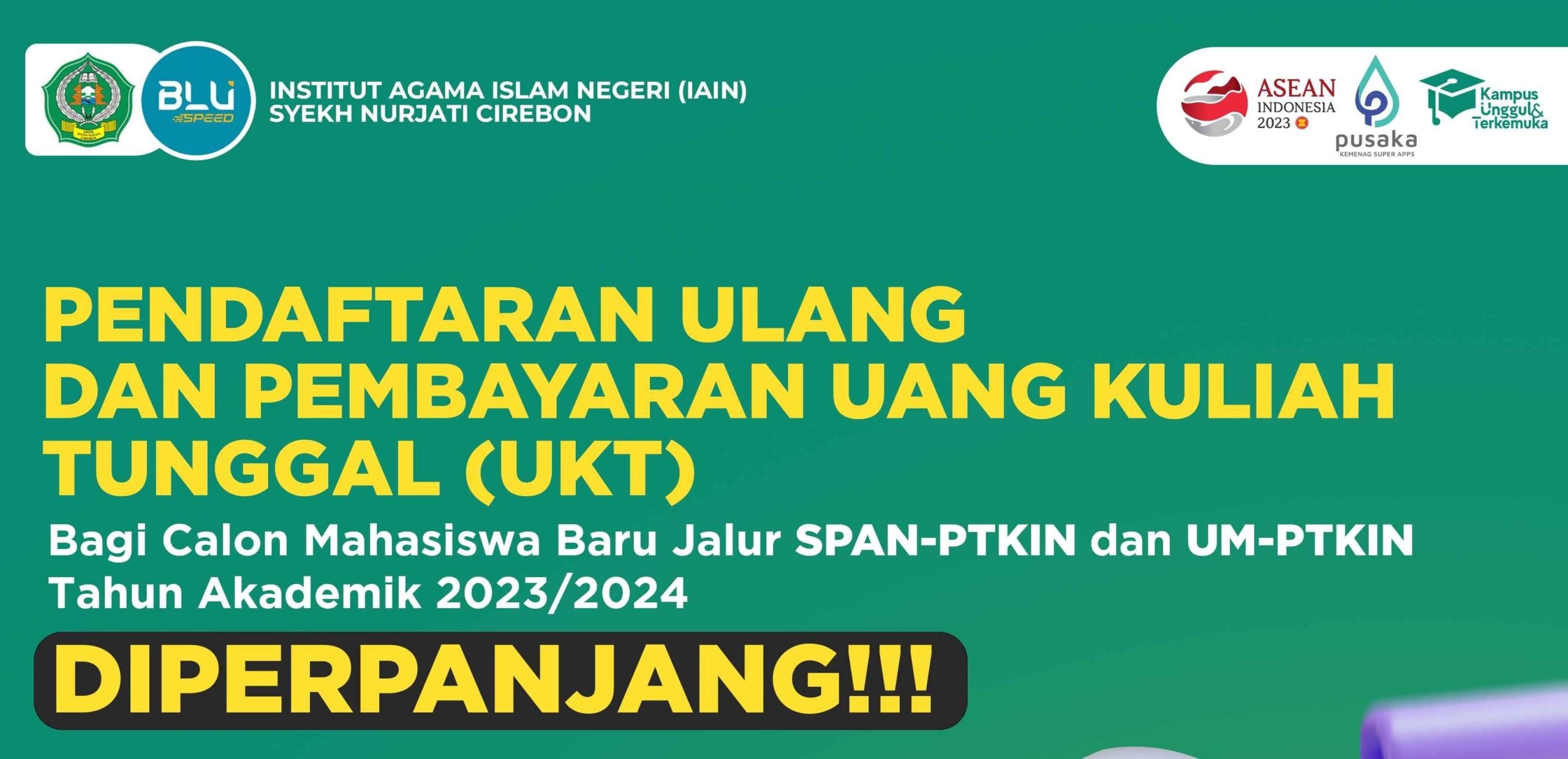 Perpanjangan Pendaftaran ulang dan Pembayaran Uang Kuliah Tunggal (UKT) bagi calon Mahasiswa Baru Jalur SPAN-PTKIN dan UM-PTKIN IAIN SNJ Cirebon Tahun Akademik 2023/2024