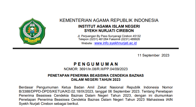 12 September 2023 • PENGUMUMAN PENETAPAN PENERIMA BEASISWA CENDEKIA BAZNAS DALAM NEGERI TAHUN 2023 Unduh Pengumuman : Klik di sini Pengumuman