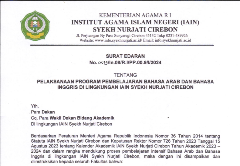 31 January 2024 • PENGUMUMAN PELAKSANAAN PROGRAM PEMBELAJARAN BAHASA ARAB DAN BAHASA INGGRIS Dl LINGKUNGAN lAlN SYEKH NURJATI CIREBON UNDUH SURAT EDARAN PPB Pengumuman
