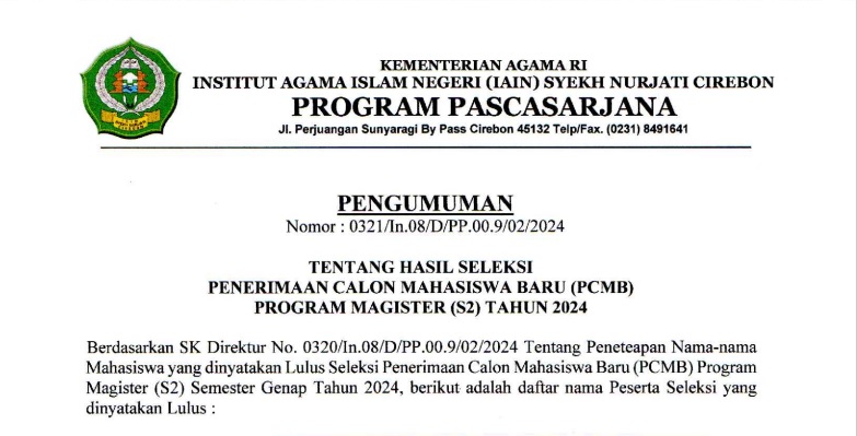 9 February 2024 • Pengumuman Hasil Seleksi PCMB Program Magister Tahun Akademik 2024 Untuk Informasi Selengkapnya Download Link dibawah ini: PENGUMUMAN HASIL SELEKSI PCMB MAGISTER S2 2024 (1) Berita Informasi Kegiatan