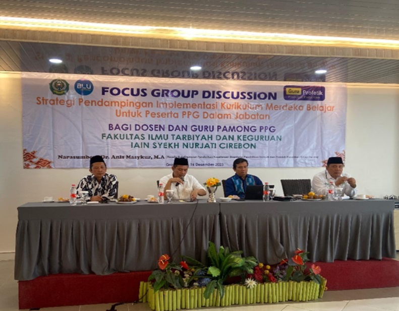 Menindaklanjuti kesuksesan angka kelulusan Program Pendidikan Profesi Guru (PPG) 2023 yang naik menjadi 85%, Fakultas Ilmu Tarbiyah dan Keguruan IAIN Syekh Nurjati Cirebon selenggarakan Focus Group Discussion (FGD) “Strategi Pendampingan Implementasi Kurikulum Merdeka Belajar untuk Peserta PPG dalam Jabatan” di Ruang Flamboyan Grand Tryas Hotel, Jalan Tentara Pelajar Nomor 103 – 107, Kejaksan Cirebon pada Hari Senin 18 Desember 2023 pukul 08.00 – 16.00 WIB.
