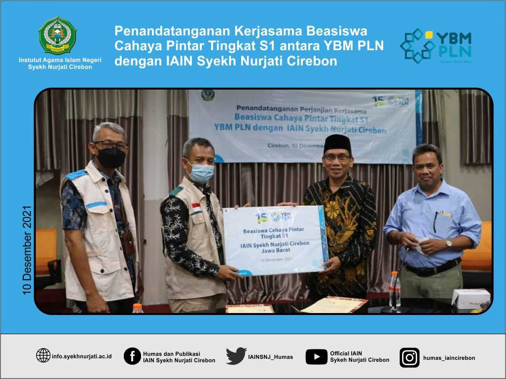 Yayasan Baitul Maal (YBM) Perusahaan Listrik Nasional (PLN) mengadakan MoU dengan Institut Agama Islam Negeri (IAIN) Syekh Nurjati Cirebon bertempat di aula gedung senat rektorat lantai 2. Dalam kegiatan MoU tersebut dari pihak PLN di wakili oleh Pak. Mirza (Ketua Bidang III YBM PLN) beserta jajarannya, rombongan disambut langsung oleh Dr. H. Sumanta, M.Ag (Rektor) didampingi, Dr. H. Ilman Nafi’a, M.Ag (Warek III), beserta staff pimpinan. Setelah penandatangann MoU, dilanjutkan dengan penyerahan beasiswa Cahaya Pintar Tingkat S1 untuk mahasiswa IAIN Syekh Nurjati Cirebon khususnya untuk mahasiswa yang kurang mampu (dhuafa), beasiswa tersebut ditujukan keapada minimal 50 mahasiswa (dhuafa) dengan maksimal dana yang diberikan.