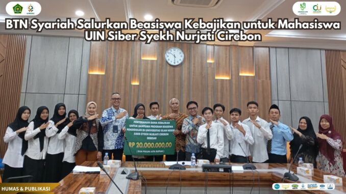 UIN Siber Cirebon — Sebagai wujud kepedulian terhadap dunia pendidikan dan komitmen dalam memperkuat ekosistem ekonomi syariah di perguruan tinggi, Bank Tabungan Negara (BTN) Syariah Kantor Cabang Syariah (KCS) Cirebon menyalurkan Bantuan Beasiswa Kebajikan kepada mahasiswa UIN Siber Syekh Nurjati Cirebon.