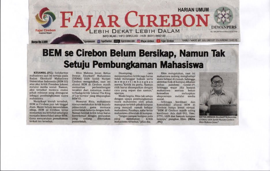13 October 2021 • BEM Se-Cirebon Belum Bersikap Namun Tak Setuju Pembungkaman Mahasiswa (Fajar Cirebon/7 Juli 2021) BEM Se-Cirebon Belum Bersikap Namun Tak Setuju Pembungkaman Mahasiswa Kliping Digital