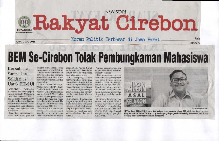 13 October 2021 • 1 Views • BEM Se-Cirebon Tolak Pembungkaman Mahasiswa (Rakyat Cirebon/ 2 Juli 2021) BEM Se-Cirebon Tolak Pembungkaman Mahasiswa Kliping Digital
