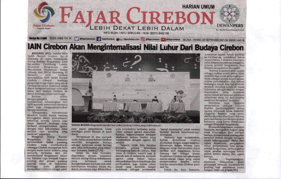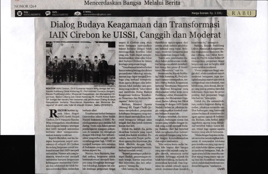 15 October 2021 • 1 Views • Dialog Budaya Keagamaan dan Transformasi IAIN Cirebon Ke UISSI, canggih dan Moderat (Suara Cirebon/24 September 2021) Dialog Budaya Upaya Moderasi Beragama Kliping Digital