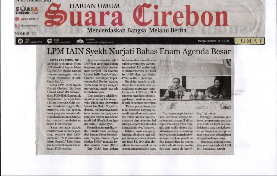 15 October 2021 • 1 Views • LPM IAIN Syekh Nurjati Bahas Enam Agenda Besar (Suara Cirebon/24 September 2021) LPM IAIN Syekh Nurjati Bahas Enam Agenda Besar Kliping Digital