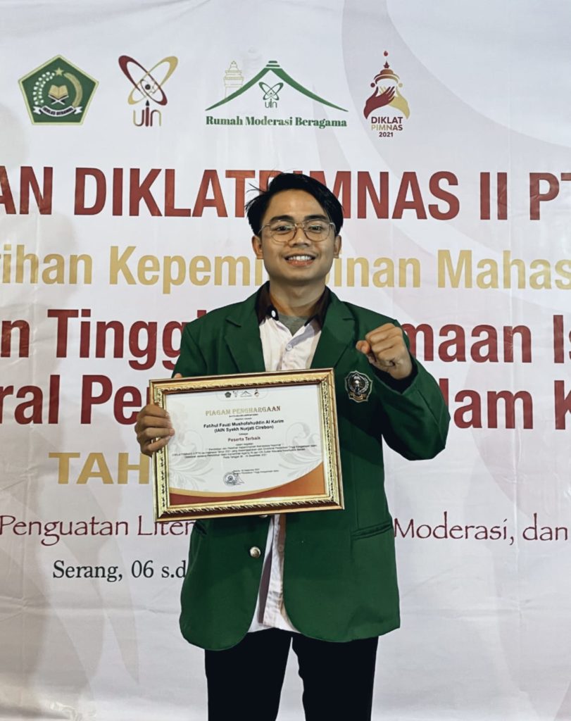Fatihul Fauzi Mushofahuddin Al Karim, semester 7 Jurusan PGMI, IAIN Syekh Nurjati Cirebon dinobatkan sebagai peserta terbaik dengan nilai tertinggi pada gelaran Pendidikan dan Pelatihan Kepemimpinan Mahasiswa Nasional Ke II di UIN Banten.