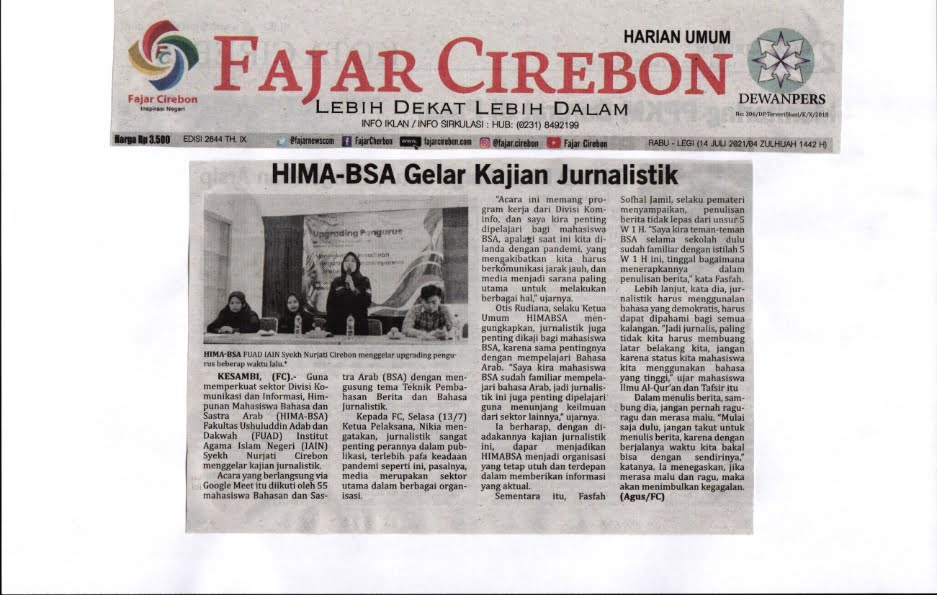 Home » Pos » Kliping Digital » HIMA-BSA Gelar Kajian Jurnalistik (Fajar Cirebon/ 14 Juli 2021)