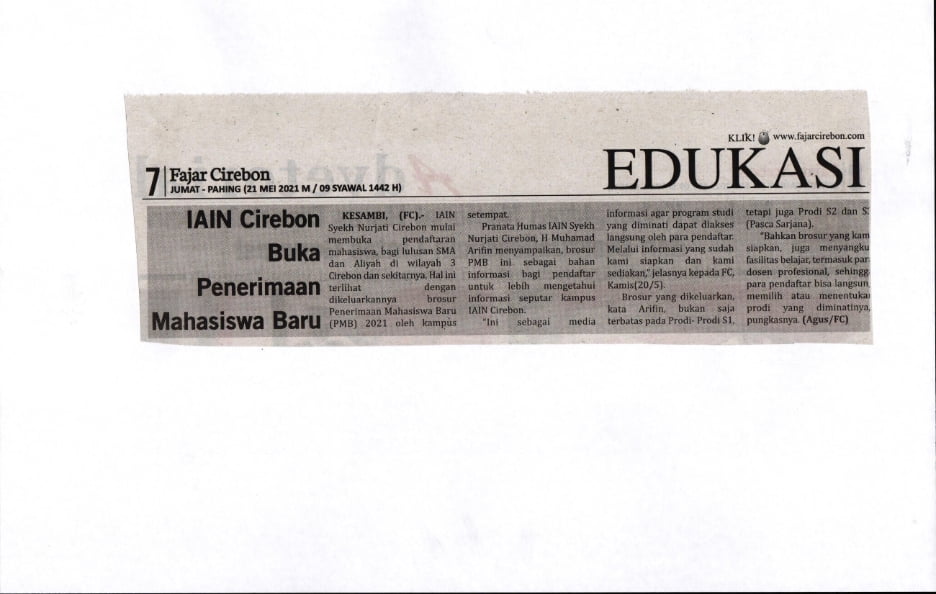 IAIN Cirebon Buka Penerimaan Mahasiswa Baru (Fajar Cirebon/21 Mei 2021)