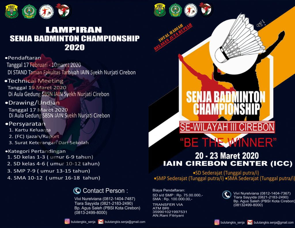 Ketum mengatakan, “ Senja Badminton Championship merupakan kegiatan perdananya di tahun 2020. Selain lomba Badminton, UKM Bulutangkis IAIN SNJ Cirebon juga masih memiliki program lainnya kedepan”. Ketum menambahkan, pada lomba bergengsi ini pendaftaran dibuka pada 17 Februari 2020 hingga 20 Maret 2020, di STAND Taman Fakultas Tarbiyah IAIN Syekh Nurjati Cirebon. Sementara untuk Tekchnikal Meeting dilaksanakan pada tanggal 19 Maret 2020 dan Drawing/Undian pada tanggal 17 Maret 2020 di Aula Gedung SBSN IAIN Syekh Nurjati Cirebon. Sementara contak person bisa menghibungi Bibi Nurelviana di nomor hp 081214047487, Tiara Sayyida di nomor hp 082121832490, dan Agus Saleh (PBSI Kota Cirebon) di nomor hp 081324998000.