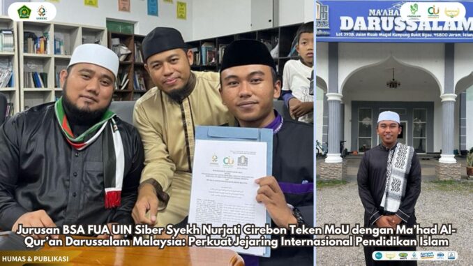 Penandatanganan MoU antara Jurusan BSA FUA UIN Siber Syekh Nurjati Cirebon dan Ma’had Al-Qur’an Darussalam Malaysia menjadi tonggak penting dalam diplomasi akademik UIN Siber Syekh Nurjati Cirebon.
