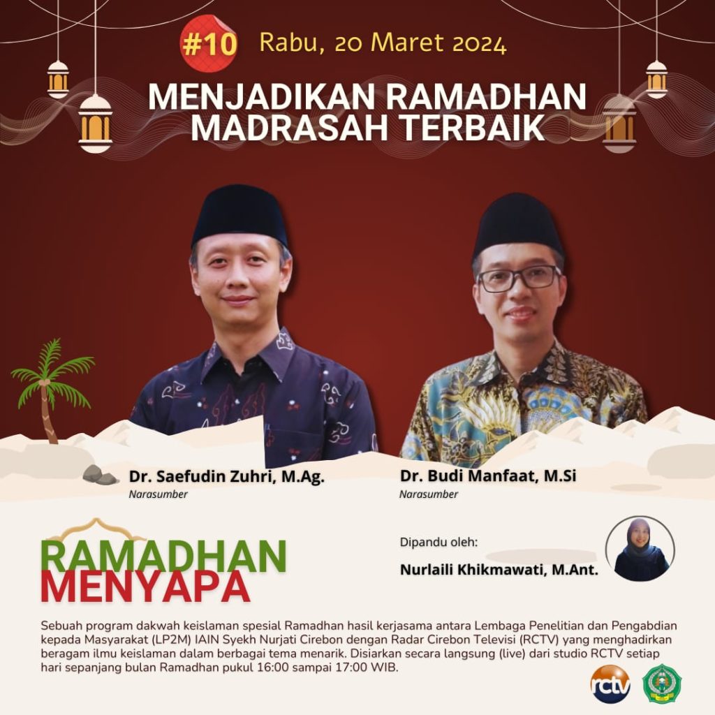 IAIN Cirebon – Hari kesepuluh “Ramadhan Menyapa” kembali menghiasi layar televisi dengan kehadiran dua tokoh terkemuka, Dr. H Saefudin Zuhri, M.Ag. dan Dr. Budi Manfaat, M.Si. Diskusi kali ini mengangkat tema yang menggugah pikiran: “Menjadikan Ramadhan Madrasah Terbaik”. Rabu, (20/03/2024).