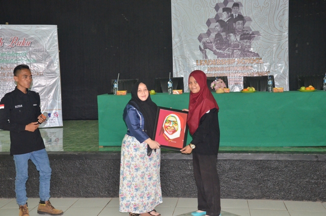 Raja Ratu Arimbi menerima lukisan dari salah satu panitia Leadership School di Gedung ICC IAIN Syekh Nurjati Cirebon.