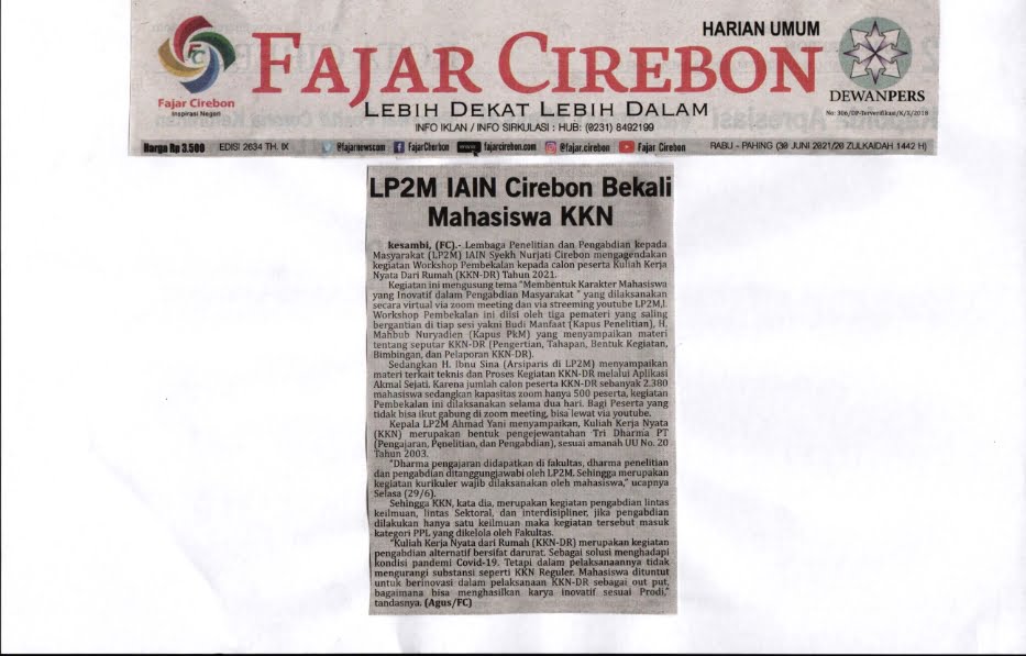 Home » Blog » Kliping Digital » LP2M IAIN Cirebon Bekali Mahasiswa KKN (Fajar Cirebon/30 Juni 2021)