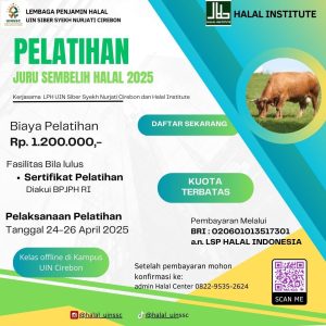 UIN Siber Cirebon – Dalam rangka menyambut Hari Raya Idul Adha 1446 H, Lembaga Penjaminan Halal UIN Siber Syekh Nurjati Cirebon mengadakan pelatihan Juru Sembelih Halal ruminansia (Sapi, kambing, kerbau, dll) dan unggas. Pelatihan yang akan digelar dari tanggal 24 – 26 April 2025 ini diadakan bekerjasama dengan lembaga pelatihan Halal Institute. Halal institute merupakan lembaga pelatihan standar BNSP (Badan Nasional Sertifikasi Profesi) dan berpengalaman dan teruji dalam dunia pelatihan SDM halal.