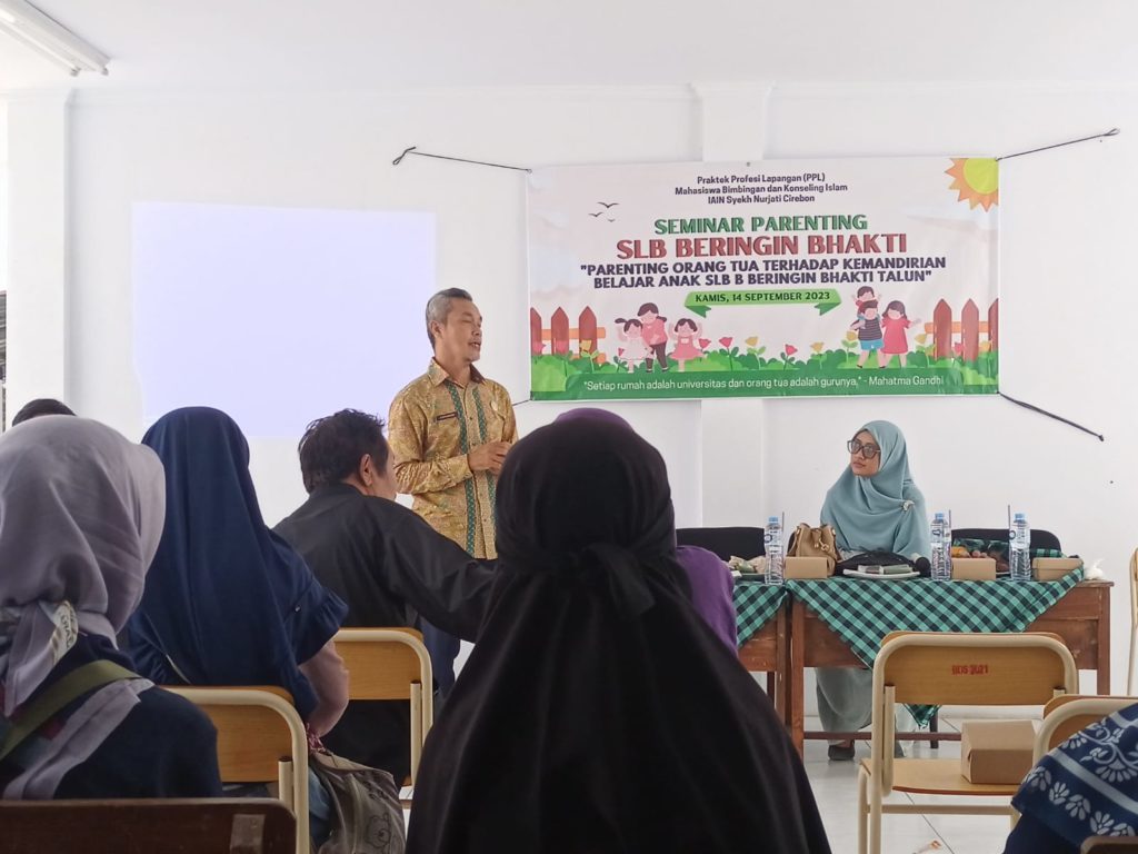 IAIN Cirebon – Mahasiswa Fakultas Dakwah dan Komunikasi Islam (FDKI) sedang melaksanakan kegiatan Praktik Pengalaman Lapangan (PPL) dari Program Studi Bimbingan dan Konseling Islam (BKI) IAIN Syekh Nurjati Cirebon, mereka menggelar seminar parenting kepada orang tua dari anak berkebutuhan khusus. Seminar mengangkat tema: “Parenting Orang Tua terhadap Kemandirian Belajar Anak SLB-B Beringin Bhakti Talun”. Kamis (14/9/2023).