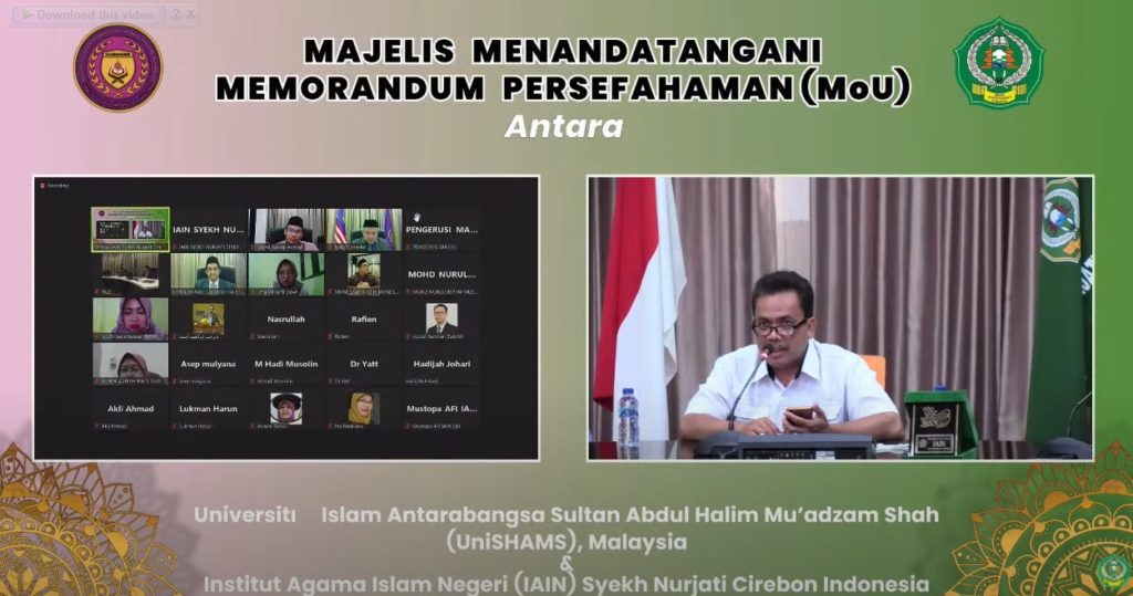 Institut Agama Islam Negeri (IAIN) Syekh Nurjati Cirbeon, Indonesia menggelar kegiatan Momerandum of Understanding (MoU) dengan Universiti Islam Antarbangsa Sultan Abdul Halim Mu’adzam Shah (UniSHAMS) Malaysia secara firtual melalui zoom meeting. Kegiatan tersebut dihadiri unsur pimpinan masing-masing perguruan tinggi secara online.
