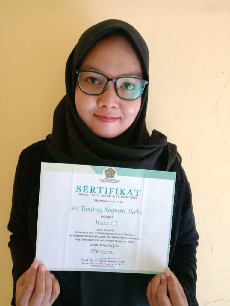 Sri berhasil menyabet juara III dalam kegiatan Bibliobattle dan Kegemaran Budaya Membaca Perpustakaan Badan Litbang dan Diklat Kementrian Agama RI yang diselenggarakan pada Rabu, 12 Agustus 2020 lalu.