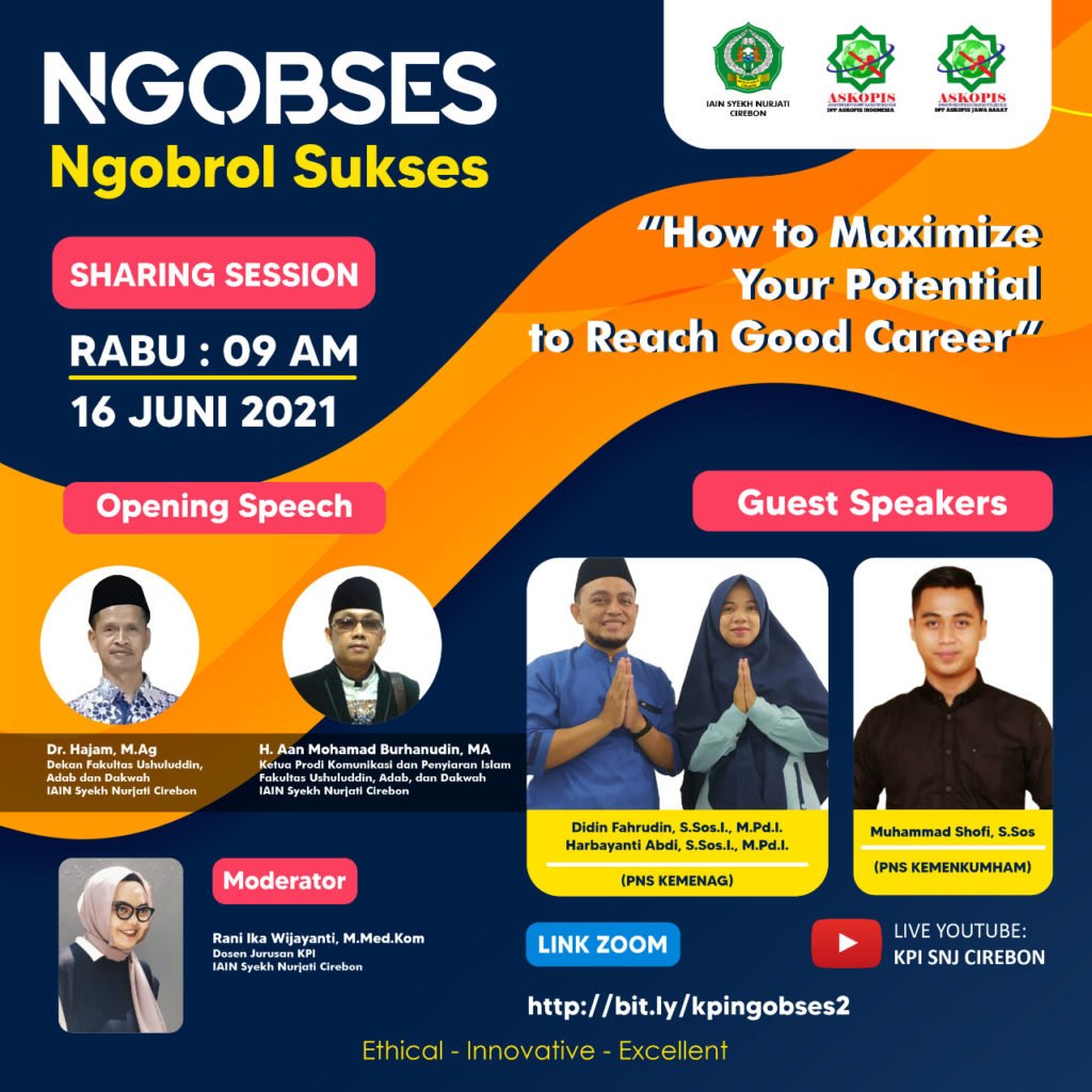 Program Studi Komunikasi dan Penyiaran Islam (KPI) Fakultas Ushuluddin, Adab dan Dakwah (FUAD) IAIN Syekh Nurjati Cirebon menggelar kegiatan Sharing Session “Ngobses (Ngobrol Sukses)” bersama Alumni KPI Berprestasi dengan tema “How to Maximize Your Potential to Reach Good Career”. Rabu, (16/6/2021).
