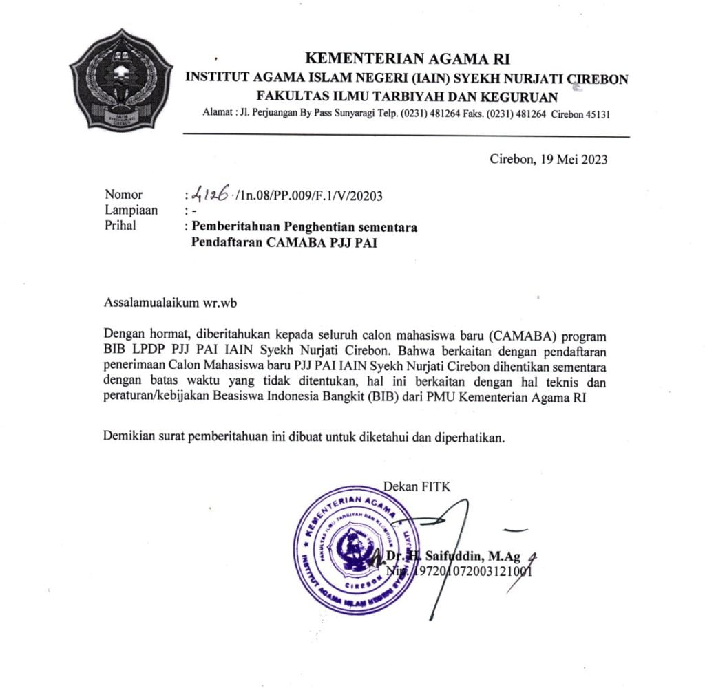 Pemberitahuan, Penghentian Sementara Pendaftaran CAMABA PJJ PAI IAIN Cirebon Tahun 2023