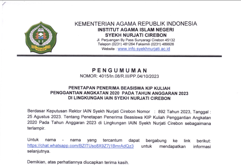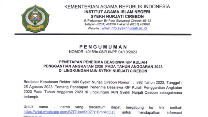 PENETAPAN PENERIMA BEASISWA KIP KULIAH PENGGANTIAN ANGKATAN 2020 PADA TAHUN ANGGARAN 2023 DI LINGKUNGAN IAIN SYEKH NURJATI CIREBON
