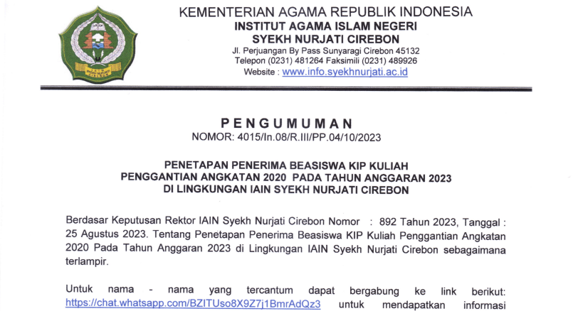 PENETAPAN PENERIMA BEASISWA KIP KULIAH PENGGANTIAN ANGKATAN 2020 PADA TAHUN ANGGARAN 2023 DI LINGKUNGAN IAIN SYEKH NURJATI CIREBON