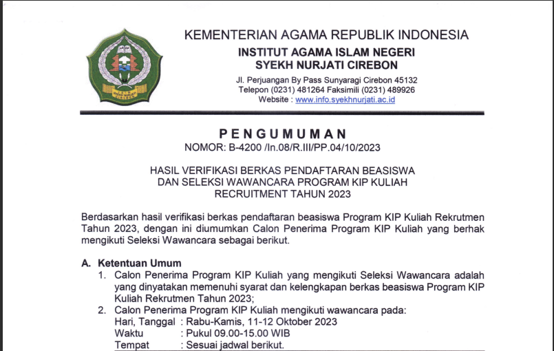 Berdasakan hasil verifikasi berkas pendaftaran beasiswa Program KIP Kuliah Rekrutmen Tahun 2023, dengan ini diumumkan Calon Penerima Program KIP Kuliah yang berhak mengikuti Seleksi Wawancara sebagai berikut.