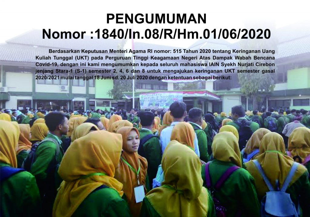 Berdasarkan Keputusan Menteri Agama RI nomor: 515 Tahun 2020 tentang Keringanan Uang Kuliah Tunggal (UKT) pada Perguruan Tinggi Keagamaan Negeri Atas Dampak Wabah Bencana Covid-19, dengan ini kami mengumumkan kepada seluruh mahasiswa IAIN Syekh Nurjati Cirebon jenjang Stara-1 (S-1) semester 2, 4, 6 dan 8 untuk mengajukan keringanan UKT semester gasal 2020/2021 mulai tanggal 18 Juni sd. 20 Juli 2020 dengan ketentuan sebagai berikut: