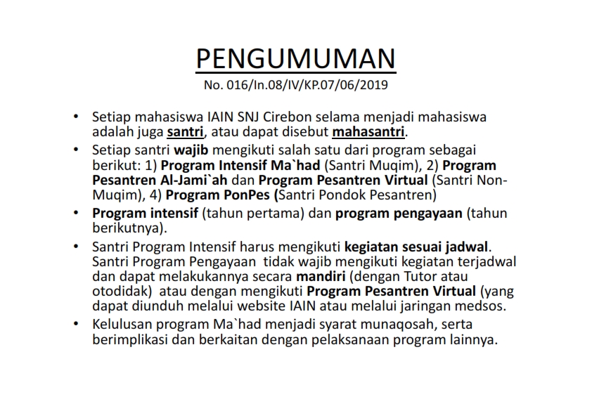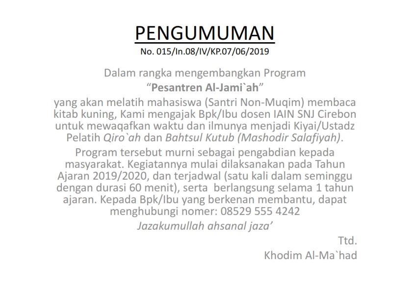 Pengumuman (Ma’had Al Jami’ah) 21 Juni 2019 arifin Informasi 0 Link Dibawah : Pengumuman Ma`had (1) Humas dan Publikasi