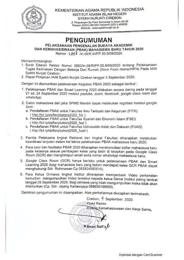 Pengumuman (PBAK Tahun 2020) 7 September 2020 arifin Pengumuman 0 pengumuman PBAK 2020 Humas dan PublikasiIAIN Syekh Nurjati CirebonPBAK