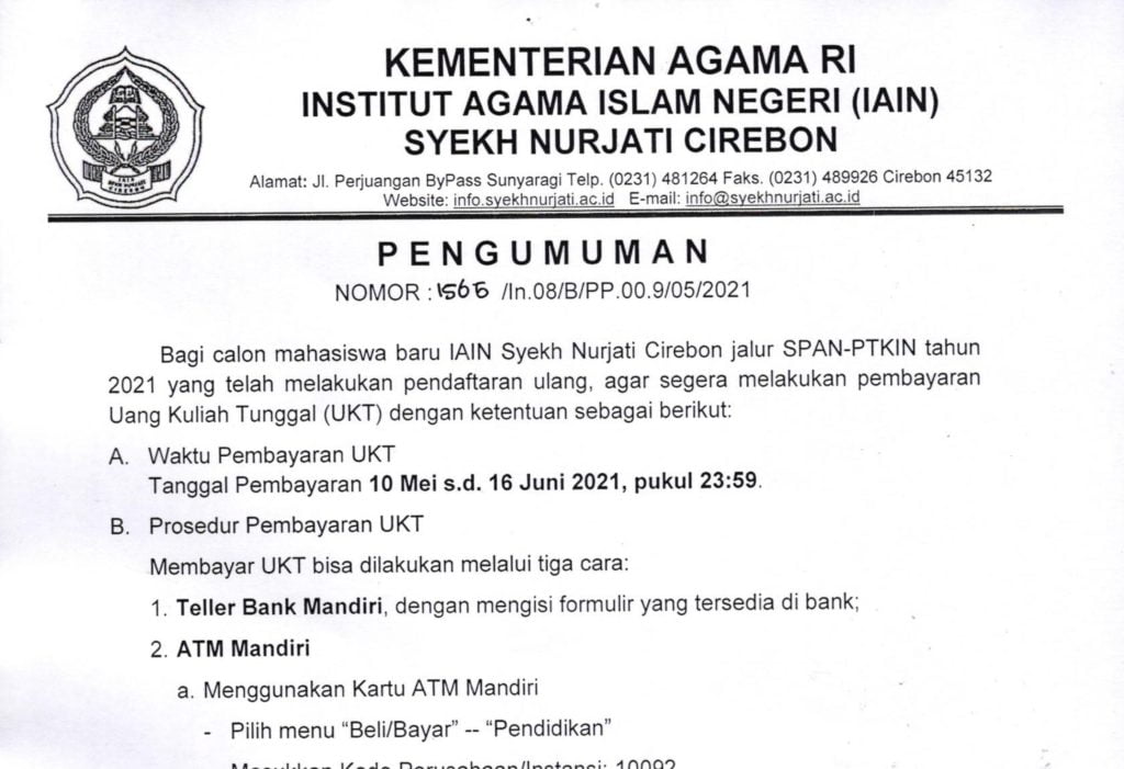 Unduh Pengumuman Pembayaran UKT Jalur SPAN-PTKIN Tahun 2021 :