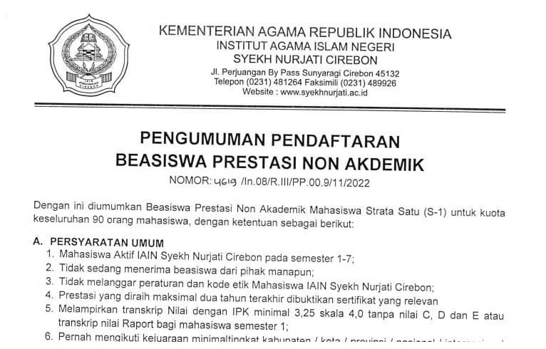 PENGUMUMAN PENDAFTARAN BEASISWA PRESTASI NON AKDEMIK IAIN SYEKH NURJATI CIREBON TAHUN 2022 3 November 2022 oleh arifin Unduh Pengumuman : PENGUMUMAN PENDAFTARAN BEASISWA PRESTASI NON AKADEMIK 2022