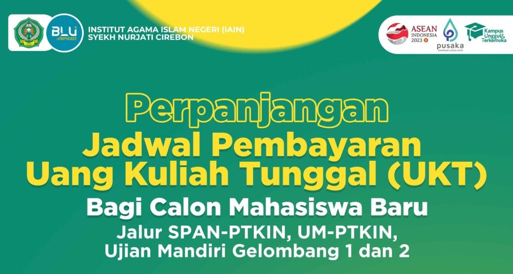 Berdasarkan Pengumuman Nomor 2642/ln.08/R/PP.00.9/07/2023 tanggal 12 Juli 2023 tentang Perubahan Jadwal Pelaksanaan Herregistrasi Semester Ganjil Tahun Akademik 2023/2024 dan Pengumuman Nomor 2967/ln.08/R/PP.00.9/08/2023 Tanggal 31 Juli 2023 tentang pembayaran Uang Kuliah Tunggal (UKT) bagi jalur SPAN-PTKIN, UM-PTKIN, Jalur Ujian Mandiri Gelombang 1 dan Jalur Ujian Mandiri Gelombang 2 Tahun Akademik 2023/2024, selanjutnya diumumkan kepada seluruh calon mahasiswa baru, bahwa Pembayaran Uang Kuliah Tunggal (UKT) diperpanjang