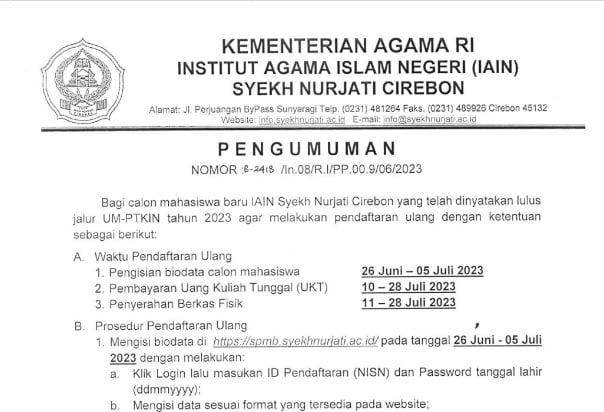- Tata Cara Daftar Ulang Calon Mahasiswa Baru Jalur UM PTKIN 2023