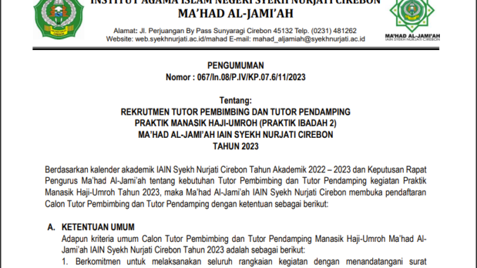 Pengumuman Rekrutmen Tutor Pembimbing dan Pendamping Praktek Manasik Haji dan Umroh Ma’had Al Jami’ah IAIN Syekh Nurjati Cirebon 8 November 2023 arifin Pengumuman 0 Rekrutmen Tutor Manasik Haji 2023