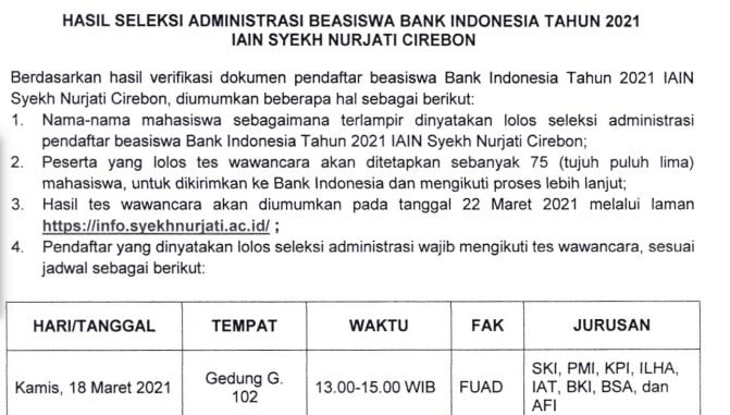 PENGUMUMAN SELEKSI ADMINISTRASI BEASISWA BI 15 Maret 2021 arifin Pengumuman 0 UNDUH PENGUMUMAN DAN DAFTAR PESERTA SELEKSI WAWANCARA BI PENGUMUMAN SELEKSI ADMINISTRASI BI Akademiksi IAINhumasdanpublikasiIAIN Syekh Nurjati CireboniainsyekhnurjaticireboniainsyeknurjaticirebonUISSIcirebonUISSIsyekhnurjaticirebon