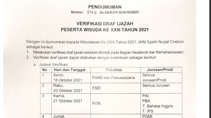 PENGUMUMAN VERIFIKASI DRAF IJAZAH PESERTA WISUDA KE XXIII TAHUN 2021 15 Oktober 2021 arifin Pengumuman 0 UNDUH PENGUMUMAN Pengumuman Verifikasi Ijazah-2021