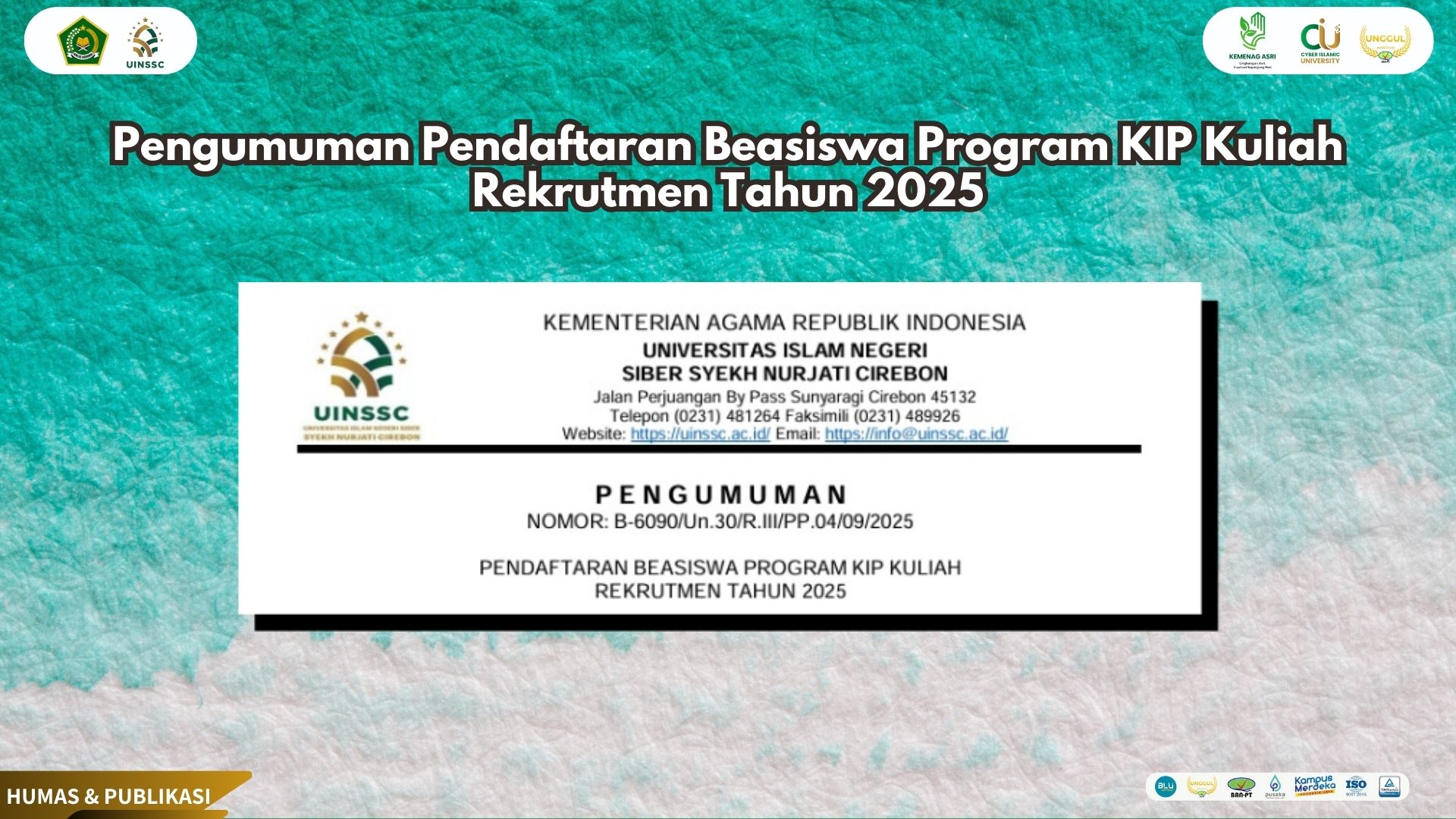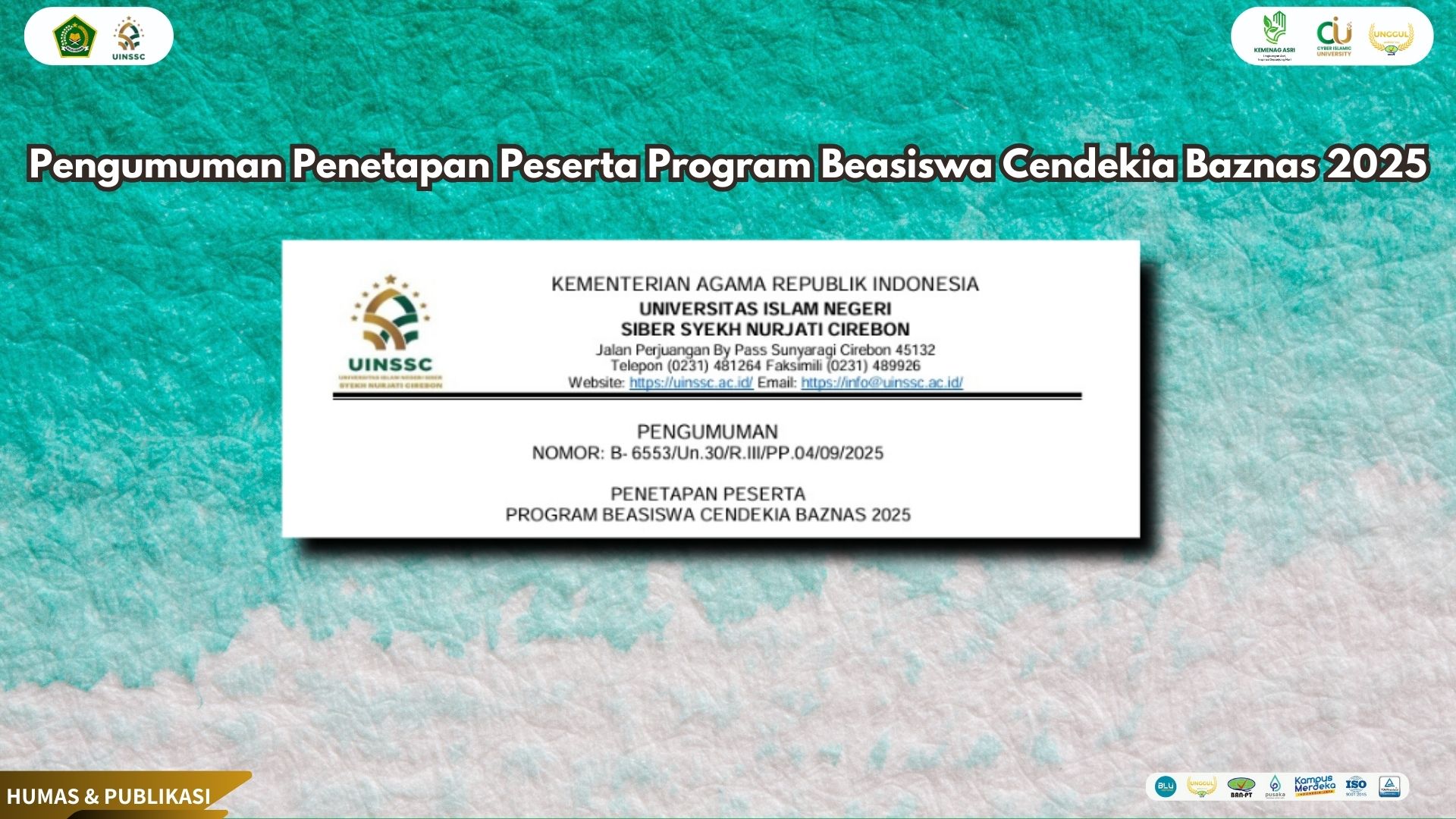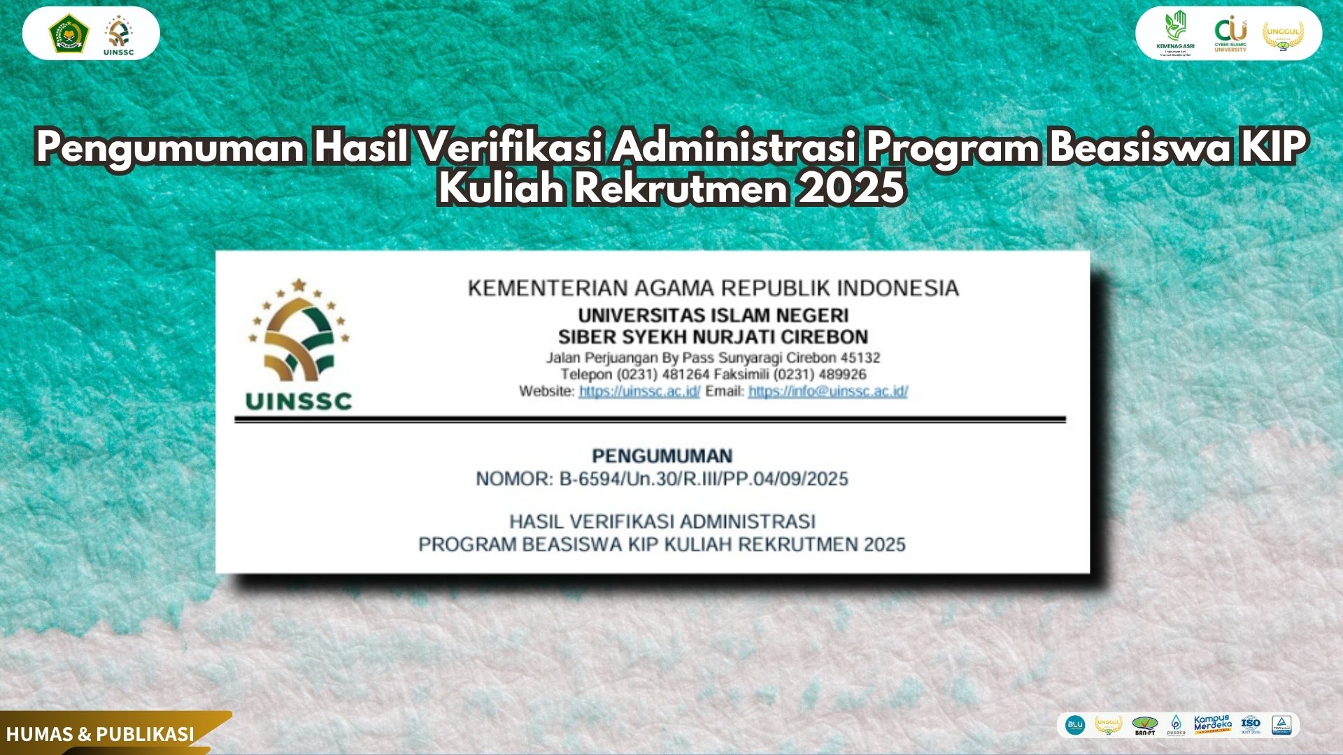 PENGUMUMAN PENGUMUMAN “UIN Siber Syekh Nurjati Cirebon: Bersama Kita Wujudkan Kampus yang Inklusif, Berkeadilan, dan Ramah Disabilitas.” 4 November 2025 Pengumuman Pendaftaran Wisuda Sarjana, Magister, dan Doktor Ke-3 Universitas Islam Negeri Siber Syekh Nurjati Cirebon 28 Oktober 2025 Pengumuman Hasil Seleksi Program Beasiswa KIP Kuliah Rekrutmen Tahun 2025 22 Oktober 2025 Pengumuman Pengambilan Ijazah dan Yudisium Wisuda Sarjana, Magister dan Doktor Gelombang II UIN Siber Syekh Nurjati Cirebon 16 Oktober 2025 Pengumuman Hasil Verifikasi Administrasi Program Beasiswa KIP Kuliah Rekrutmen 2025 30 September 2025 Pengumuman Penetapan Peserta Program Beasiswa Cendekia Baznas 2025 26 September 2025 Pengumuman Pelaksanaan Pre Test Kecakapan Bahasa Inggris dan Arab Bagi Mahasiswa Baru UIN Siber Syekh Nurjati Cirebon Tahun Akademik 2025/2026 22 September 2025 Pengumuman Pendaftaran Beasiswa Program KIP Kuliah Rekrutmen Tahun 2025 10 September 2025 « Sebelumnya Berikutnya »