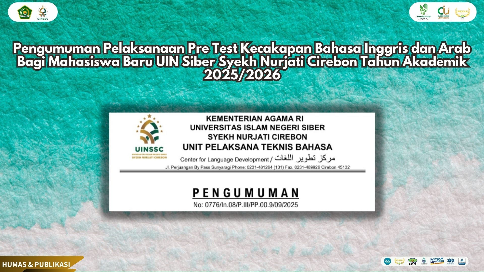 Pengumuman Pelaksanaan Pre Test Kecakapan Bahasa Inggris dan Arab Bagi Mahasiswa Baru UIN Siber Syekh Nurjati Cirebon Tahun Akademik 2025/2026 22 September 2025
