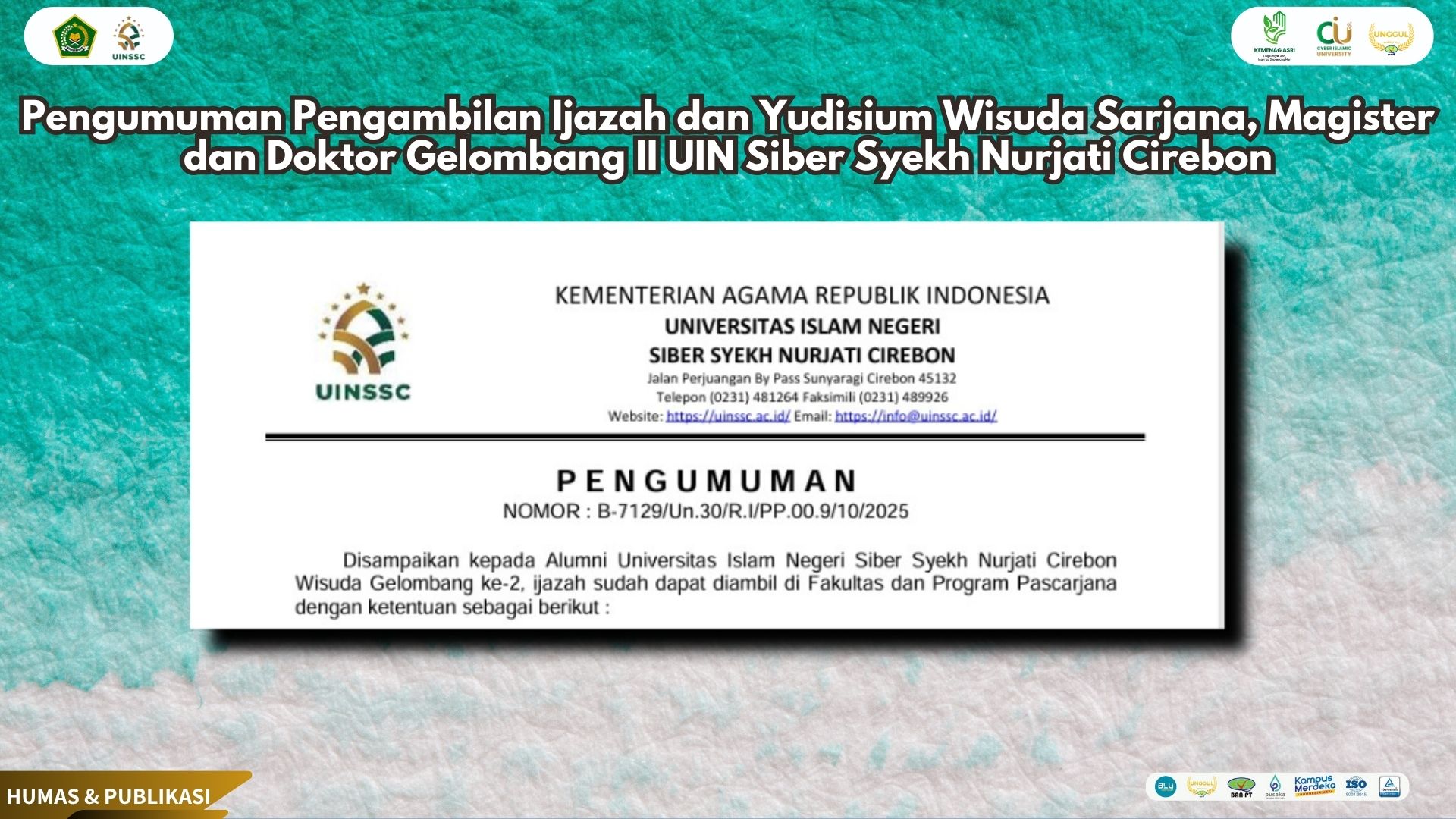 Pengumuman Pengambilan Ijazah dan Yudisium Wisuda Sarjana, Magister dan Doktor Gelombang II UIN Siber Syekh Nurjati Cirebon 16 Oktober 2025