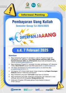Berdasarkan Pengumuman Nomor B-6763//ln.08/R.I/PP.00.9/12/2024 tanggal Desember 2024 tentang Pelaksanaan Herregistrasi Semester Genap Tahun Akademik 2024/20245 bagi mahasiswa Program Sarjana, Magister dan Doktor selanjutnya diumumkan kepada seluruh mahasiswa Program Sarjana, Magister dan Doktor, bahwa Pembayaran Uang Kuliah Tunggal (UKT) diperpanjang.