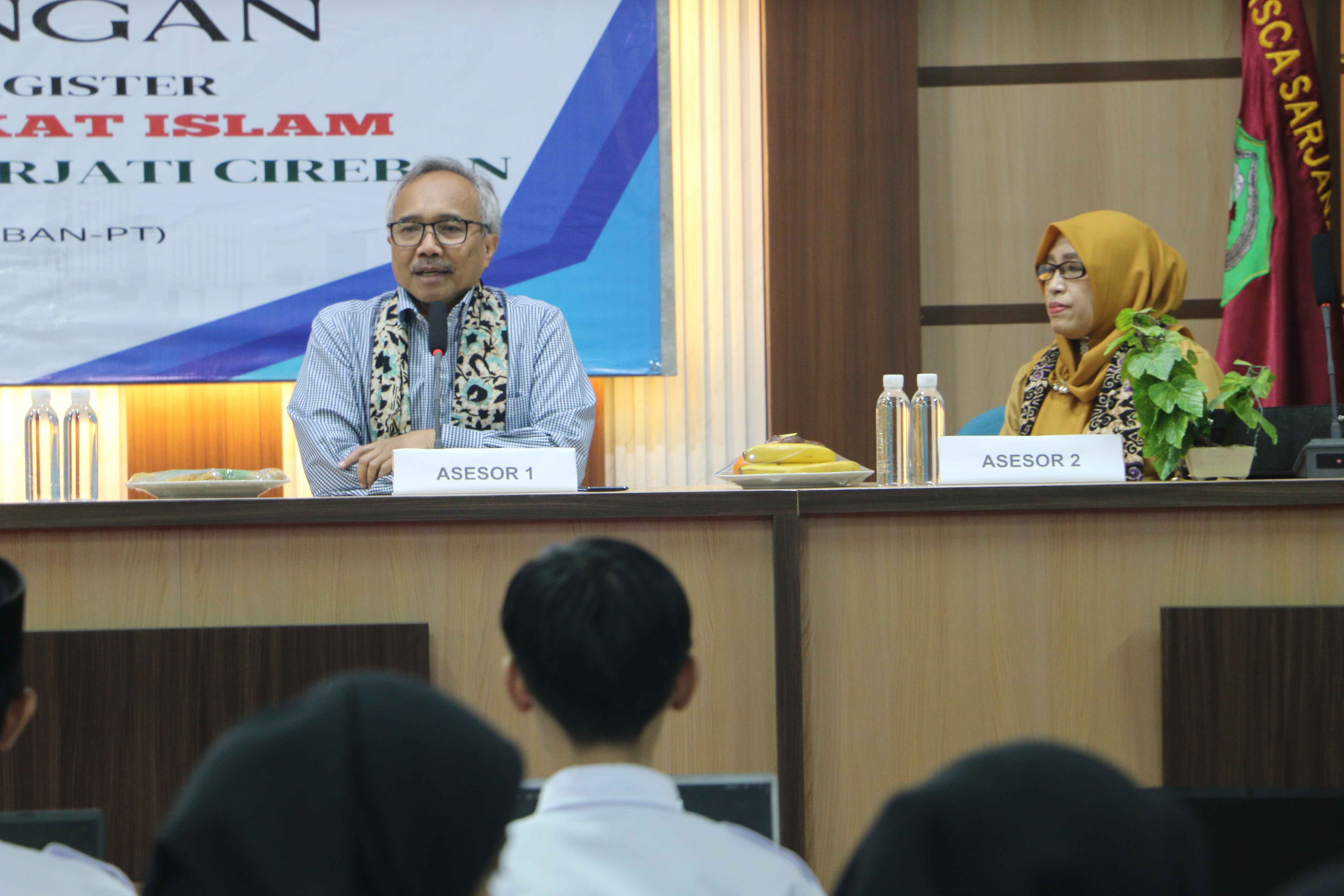 Prof. Dr. H. Jamali, M.Ag., Wakil Rektor I Bidang Akademik dan Pengembangan Kelembagaan sekaligus Plt. Direktur Pascasarjana, membuka acara dengan sambutan hangat. Ia menyampaikan apresiasi kepada tim asesor atas kedatangannya di Cirebon serta penghargaan setinggi-tingginya kepada semua pihak yang telah berkontribusi, khususnya Tim LPM.