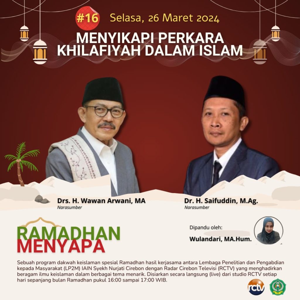 IAIN Cirebon – Lembaga Penelitian dan Pengabdian kepada Masyarakat (LP2M) IAIN Syekh Nurjati Cirebon bersama Radar Cirebon Televisi (RCTV) menjalin kerjasama yang harmonis dalam menghadirkan program khusus “Ramadhan Menyapa”. Pada hari keenambelas Ramadhan, Selasa, 26 Maret 2024, acara ini menampilkan diskusi yang mengangkat tema penting, yakni “Menyikapi Perkara Khilafiyah dalam Islam”.